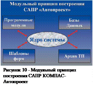 Одним из основных преимуществ системы КОМПАС-Автопроект является ее открытость, возможность модернизации без участия разработчика. При этом корректируются состав и структура всех баз данных; обеспечивается подключение новых информационных массивов, созданных пользователем, с организаций иерархической, реляционной и сетевой связи в них; настраиваются формы технологических документов; подключаются новые программные модули. САПР КОМПАС-Автопроект построена по модульному принципу и состоит из ядра системы, базы данных, программных модулей, шаблонов форм и архива техпроцессов (рис. 10). Открытая архитектура системы позволяет предприятиям разрабатывать свои программные модули и органично вписывать их в систему.