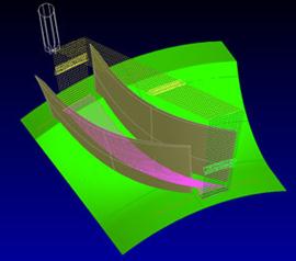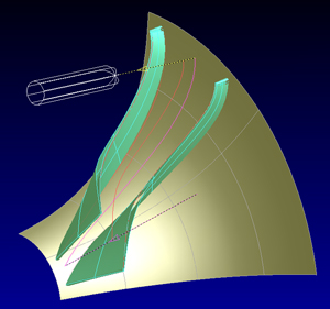 Операция позволяет создать спиральную траекторию вокруг одиночной лопатки, при этом, вектором фрезы управляет угол опережения (в направлении движения фрезы) и два угла отклонения (для первой и второй граничных кривых)