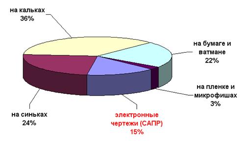 В настоящее время в архивах машиностроительных предприятий накопилось архивы конструкторской документации, размещенной на различных носителях. Соотношение объемов документов на разных носителях показано на рис. 24.