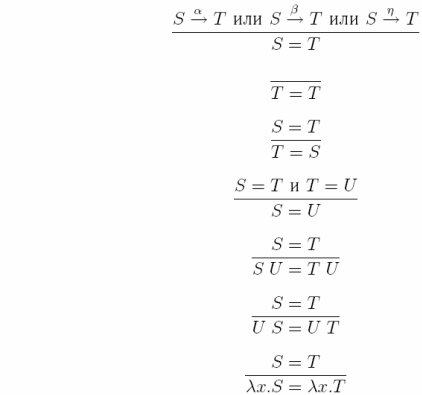 Следует отличать понятие равенства, определяемое этими формулами, от понятия синтаксической эквивалентности, которую будем обозначать специальным символом ≡. Например, λх.х ≠ λу.у, но λх.х = λу.у. Можно рассматривать синтаксическую эквивалентность термов с точностью до α -конверсий. Такую эквивалентность обозначают символом ≡ а. Это отношение определяется так же, как равенство лямбда-термов, за тем исключением, что из всех конверсий допустимы только α -конверсии. Таким образом, λх.х ≡ а λу.у.