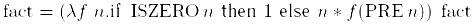 Будем обозначать комбинатор неподвижной точки Тьюринга как Y. Он может быть исползован в определении рекурсивных функций. Рассмотрим в качестве примера функцию факториал:
