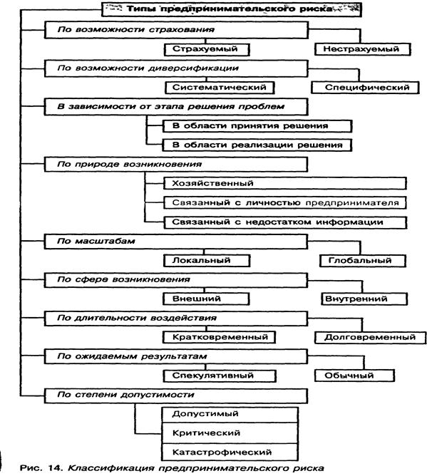 Поскольку основная задача предпринимателя – рисковать расчетливо, не переходя ту грань, за которой может произойти полный крах, следует выделять допустимый, критический и катастрофический типы риска. Допустимый риск – это угроза неполной потери прибыли от осуществления (неосуществления) того или иного проекта или от предпринимательской деятельности в целом. При данном риске потери возможны, но по размеру они меньше ожидаемой предпринимательской прибыли. Критический риск характеризуется не только потерей прибыли, но и недополучением предполагаемой выручки. В этом случае предприниматель несет убытки в сумме всех затрат, т.е. данный риск характеризуется опасностью потерь, которые превышают ожидаемую прибыль и могут привести к невозмещаемой потере всех средств, вложенных предпринимателем в данную сделку. Катастрофический риск, как правило, приводит к банкротству предпринимательской фирмы, т.е. к потере предпринимателем всех средств.
