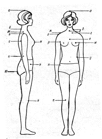 Для получения достаточно точных данных измерения производят, ориентируясь на антропометрические точки (Рис. 5). При измерении женской фигуры для целей конструирования используют следующие точки:
