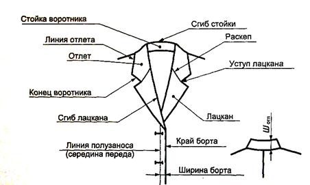 Участок соединения пиджачного воротника с изделием от точки втачивания конца воротника (точки уступа лацкана) до линии перегиба лацкана называется раскепом. Уровень раскепа в зависимости от модельного решения может быть низким, высоким или типовым (т.е. наиболее часто встречающимся на протяжении нескольких последних лет). Чем ниже линия раскепа в изделии, тем длиннее воротник. На рисунке 18 представлен внешний вид пиджачного воротника с наименованиями всех его конструктивных элементов.