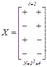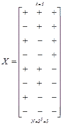 Множество всех возможных точек в k-мерном пространстве, координаты которых xi равны соответственно ±1, называется полным факторным планом (ПФК) типа 2k и соответствует вершинам k-мерного гиперкуба. Число точек полного факторного плана равно N=2k. Для k = 1, 2, 3 матрица плана будет