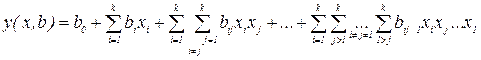 Полный факторный план дает возможность получить независимые коэффициенты регрессии, соответствующие не только линейным эффектам (bi, i=0,...,k), но и всем эффектам взаимодействия, т.е. коэффициенты bij...1 для эффектов xi xj... x1, I,j,…,1=l,...,k,