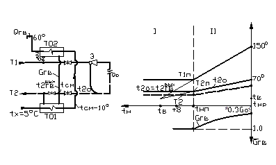 Сетевая вода после подогревателя верхней ступени ТО2 смешивается с обратной водой от отопления и используется в подогревателе нижней ступени ТО1. Более глубокое охлаждение обратной сетевой воды уменьшает расход сетевой воды на вводе. Регулирование Q гв осуществляется по диапазонам.