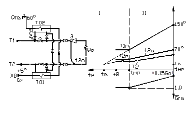 При параллельном включении подогревателей горячего водоснабжения (рис. 4.9) во II диапазоне условия теплообмена в подогревателе постоянны (при Q гв = const и ΔТ = Т 1- Т 2 = const), следовательно G гв = const..
