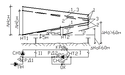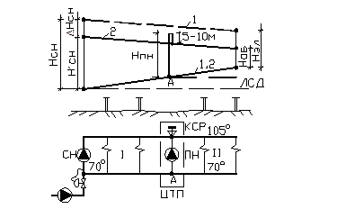 Сеть разделяется по температуре теплоносителя на две зоны. На границе двух зон при проходе воды через КСР возникают дополнительные потери напора, поэтому для нормальной работы сети напор смесительных насосов (Н пн) должен быть на 5-10 м больше расчетного перепада.