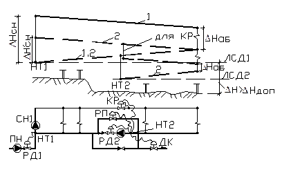 КР служит дросселирующей подстанцией на подаче. При увеличении давления в НТ2 клапан КР на подаче закрывается, одновременно на обратке закрывается РД2 и зона нижняя изолируется. Подпитка нижней зоны и поддержание давления в НТ2 осуществляется автоматически через РП из верхней зоны, находящейся под большим давлением.