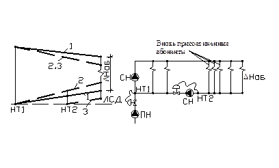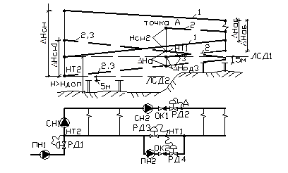 б) Увеличивающийся профиль трассы к концу сети (рис. 6.16). Защита абонентов верхней зоны от опорожнения производится с помощью РД2 и РД3. При понижении давления в НТ1 при остановке СН2 одновременно закрываются РД2 и РД3, и верхняя зона изолируется. Постоянный статический напор в верхней зоне (ЛСД1) поддерживается ПН2.