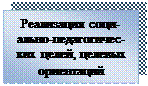 · реализация социально-педагогической и психологической помощи и поддержки личности в кризисных ситуациях (прояснение проблемы, отреагирование проблемы, осмысление путей решения проблемы, составление плана и выбор программы действий, помощь ребенку (семье) в организации выхода из проблемы, координация усилий ближайшего окружения личности, создание группы поддержки);