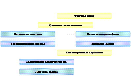 - J 44.9 - неуточнённая ХОБЛ, тяжелое течение. Хроническое легочное сердце. ДН III, ЗСН II или III степени.