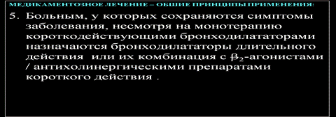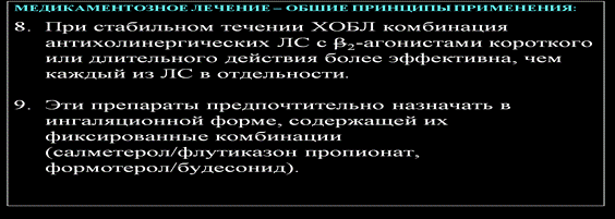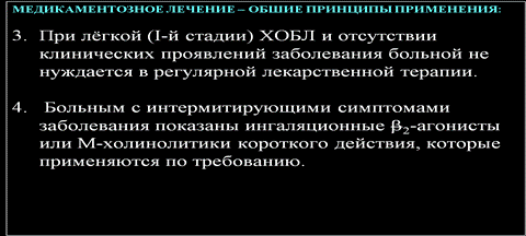 - При среднетяжёлом, тяжёлом и крайне тяжёлом течении (стадии II–IV) ХОБЛ антихолинергические ЛС считаются средствами первого выбора.