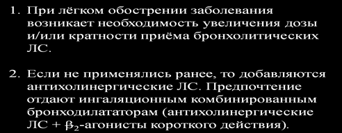 • Так как антихолинергические препараты ассоциированы с меньшим числом и более легкими побочными эффектами, рекомендовано начинать терапию с этих препаратов, а затем добавлять b2-агонисты короткого действия