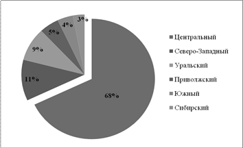 Рисунок 11 - Распределение проектов внедрения CRM-систем по федеральным округам РФ