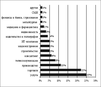 На три первые позиции суммарно приходится 58 % от общего числа внедрений. Рассматриваемые отрасли отличаются высокой частотой совершения сделок, большим количеством как корпоративных, так и частных клиентов, что вызывает необходимость автоматизации процессов взаимодействия с клиентами. В отраслевом распределении тенденция к лидирующему положению данных отраслей является устойчивой.