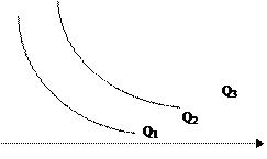 Если соединить разные технологии линией, получится изображение производственной функции (линии равного выпуска), которая получила название изокванты. На рисунке которая объем производства Q1 может быть достигнут при разной комбинации факторов производства (Т1, Т2, Тъи т.д.). Верхняя часть изокванты включает капиталоинтенсивные, нижняя – трудноинтенсивные технологии.