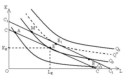 Точки А, Е, В лежат на одной изокосте СС и, следовательно, обойдутся предприятию в одну и ту же сумму С. Но наиболее предпочтительна комбинация Е, так как она обеспечивает больший объем выпуска (Q2> Q1). С другой стороны, комбинация М столь же технически эффективна, как и комбинация Е (достигается тот же объем Q2 при иной комбинации объемов К и L) — они лежат на одной и той же изокванте. при данных ценах ресурсов точка М экономически неэффективна (за ту же сумму средств С1 можно получить больший объем Q* ).