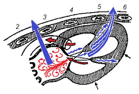 Рис.3. Механизм образования и проведения на грудную клетку шума митральной недостаточности по Олейнику. Красные стрелки указывают направление тока крови в аорту и ретроградно в левое предсердие. Сплошная синяя стрелка обозначает проведение шума к ближайшей точке выслушивания, двойная синяя стрелка – против тока крови на верхушку сердца. Извилистые стрелки показывают проведение вибраций по структурам сердца.