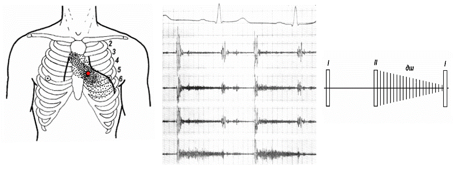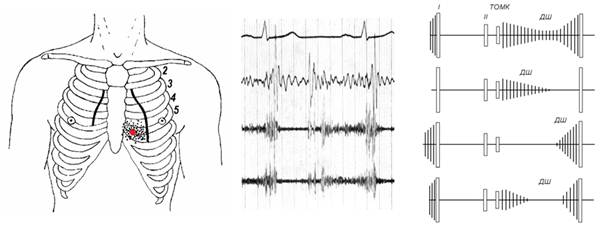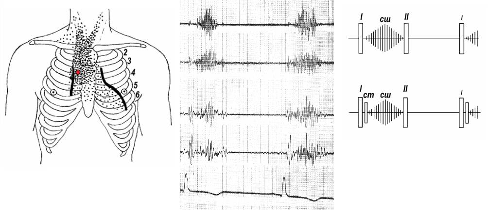 Справа – схематическое изображение звуковой картины: I,II – тоны сердца, ст – сосудистый тон, сш – систолический шум.