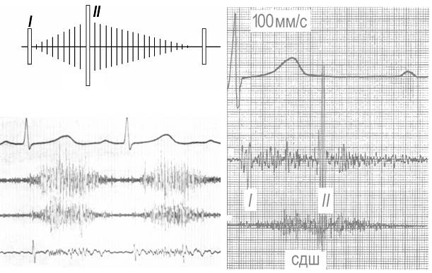 Рис. 8. Шум незаращения артериального протока. Слева вверху - схематическое изображение звуковой картины, внизу - данные ЭКГ и ФКГ (систолодиастолический шум, II тон плохо дифференцируется). Справа - второй вариант звуковой картины на ФКГ: систолодиастолический шум (СДШ), резкое усиление II тона. Запись с точки 2 лс.