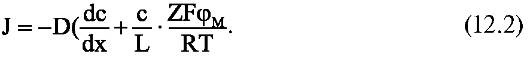 В первом приближении можно считать, что поле внутри мембраны однородно. В этом случае dp/dx = φм/l, где L - толщина мембраны, а φм - разность потенциалов между ее поверхностями, называемая мембранным потенциалом. Теперь уравнение Нернста-Планка будет иметь вид