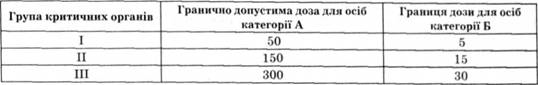 И - все тело, половые органы, красный костный мозг; II - щитовидная железа, мышцы, жировая ткань, печень, почки, селезенка, желудочно-кишечный тракт, легкие, хрусталик глаза; III - костная тканей на, кожа, кисти, предплечья, икры, стопы зависимости от группы критических органов для лиц категории А установлена??предельно допустимую дозу (ПДД) за год, а для лиц категории Б - предел дозы (ГД) за год (табл. 21818)