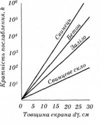 где Иу - коэффициент линейного ослабления; И - кратность ослабления (отношение дозы излучения без защиты до предельно допустимой дозы)