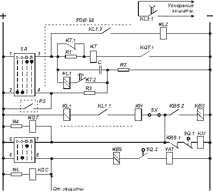 Для предотвращения многократного включения выключателя на устойчивое КЗ, что могло бы иметь место в случае застревания контактов реле KL1 в замкнутом состоянии, в схеме управления устанавливается специальное промежуточное реле KBS, имеющее две обмотки – рабочую последовательную и параллельную удерживающую. Реле KBS срабатывает при прохождении тока по катушке отключения выключателя и удерживается в сработавшем положении до снятия команды на включение. Цепь обмотки КМ при этом размыкается контактом KBS.1, благодаря чему предотвращается включение выключателя.