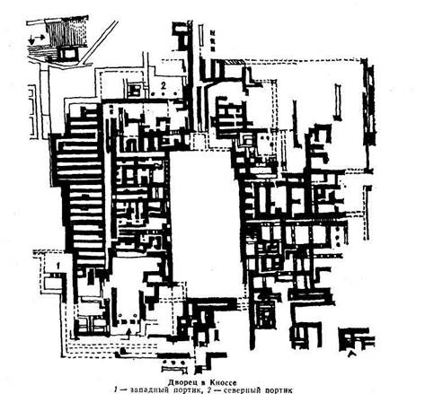 Огромный царский дворец в Кноссе несколько раз перестраивался. Но уже в первоначальном виде его композиционным центром был большой двор, к которому с западной стороны примыкали «гостиные». Восточная часть, где размещались жилые покои правителя, колонный зал и лестницы, в настоящее время реставрирована. Греки назвали руины этого сооружения «Лабиринтом», не умея разгадать его назначение. С ним связаны легенды о строителе Дедале, о Минотавре, Тесее и нити Ариадны.