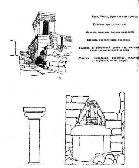 При создании плоских перекрытий в качестве несущих элементов использовались стены и пилоны, а также колонны, имевшие трехчастное деление на базу, ствол и капитель. База простой формы была плоской, ствол сужался книзу в виде конуса, а приплюснутая капитель состояла из круглого эхина и квадратного абака над ним. Оригинально решалась перемычка над входом, когда над большим каменным блоком, перекрывавшим проем входа, оставлялось треугольное отверстие в стене, что уменьшало нагрузку на перемычку. Это отверстие обычно закрывалось плитой, украшенной рельефом. Так решены входные так называемые Львиные ворота Микенского акрополя, где был найден наиболее ранний в Европе монументальный рельеф. «Микенская культура погибла в период около 1100 г. до н, з.і2і