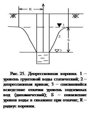 При откачке воды из скважины вследствие трения воды о частицы происходит воронкообразное понижение уровня. Образуется депрессионная воронка, имеющая в плане форму, близкую к кругу. В вертикальном разрезе воронка ограничивается депрессионными кривыми, крутизна которых возрастает по мере приближения к оси скважины (рис. 25).