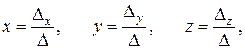 Это есть правило Крамера решения системы трех линейных уравнений с тремя неизвестными.