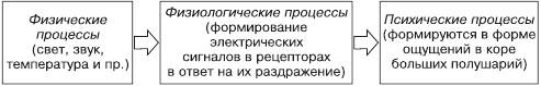 Ощущение – простейший психический процесс, состоящий в отражении отдельных свойств предметов и явлений при их непосредственном воздействии на соответствующие рецепторы. Рецепторы – это чувствительные нервные образования, которые воспринимают воздействие внешней или внутренней среды и кодируют его в виде набора электрических сигналов. Последние затем поступают в мозг, который их расшифровывает. Этот процесс сопровождается возникновением простейших психических явлений – ощущений. Психофизика ощущений показана на рис. 1.