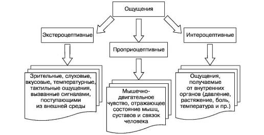 В зависимости от источника раздражений, действующих на рецепторы, ощущения подразделяются на три группы. Каждая из этих групп, в свою очередь, состоит из различных специфических ощущений (рис. 4).