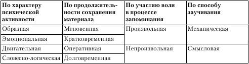 Существует два основных вида классификации видов памяти – по характеру психической активности, которая сопровождает запоминание и фиксируется в памяти, и по длительности сохранения материала (табл.3).
