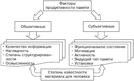 Факторы, влияющие на продуктивность памяти, можно разделить на две группы – объективные и субъективные (рис. 8). Первая группа касается в первую очередь особенностей самого запоминаемого материала, а вторая – человека, запоминающего эту информацию.