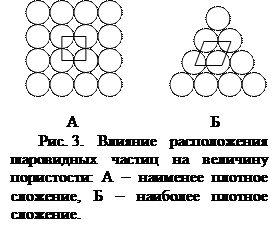 В рыхлых зернистых породах пористость обуславливается промежутками между отдельными частицами породы. Она зависит от размеров и формы этих частиц, т.е. от структурных особенностей, и характера их сложения, т.е. текстуры пород. Если представить себе однородный грунт, состоящий из частиц шаровидной формы, сложенных рядами и образующих кубы (рис. 3 А) или тетраэдры (рис. 3 Б), то, как показывают простые вычисления, в первом случае объем промежутков между шарами составит 47.6 % от всего объема, а во втором – 26.2 %.