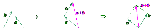 Пусть даны два вектора a и b. Чтобы сложить их, нужно совместить параллельным переносом начало и конец этих векторов. Тогда суммой этих векторов будет вектор, соединяющий начало первого и конец второго вектора (правило треугольника). Векторы можно сложить также по правилу параллелограмма, совместив начала этих векторов. Суммой векторов, в этом случае, будет диагональ параллелограмма, выходящая из начала векторов.