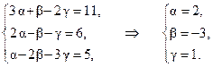 11 e 1–6 e 2+5 e 3 = a(3 e 1–2 e 2+ e 3) + b(– e 1+ e 2–2 e 3) + g(2 e 1+ e 2–3 e 3)