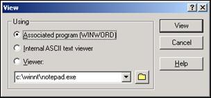 на панели инструментов. В появившемся диалоговом окне (рис. 3) с помощью переключателя можно выбрать способ просмотра: с помощью ассоциированной программы (определяется по расширению файла) ("Associated Program", в скобках указывается имя этой программы), с помощью встроенной программы просмотра ASCII-текста ("Internal ASCII Text Viewer) или же с помощью выбранной пользователем программы просмотра.). После установки нужного переключателя и указания программы просмотра щелкните по кнопке View (Просмотр) и файл будет открыт.