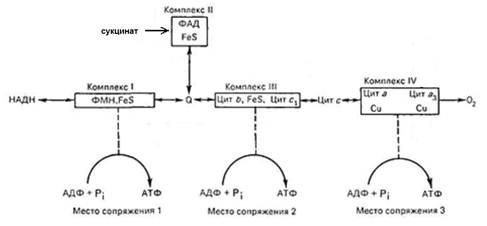 В дыхательной цепи есть только 3 участка, где перенос электронов сопряжен с накоплением энергии, достаточным для образования АТФ. Общая разность окислительно-восстановительных потенциалов между НАДН и О2 соответствует разности свободных энергий ΔG -220 кДж на пару переносимых электронов. Такого количества энергии хватило бы на синтез 4 молекул АТФ.