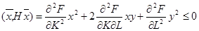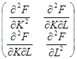 Если функция F(K, L) дважды непрерывно дифференцируема, условие вогнутости эквивалентно требованию неположительной определенности матрицы вторых производных функции F(K, L) при всех положительных значениях вектора ресурсов (K, L), т. е.