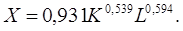– эластичность выпуска по труду. Из (1.12) видно, что коэффициент эластичности фактора показывает, на сколько процентов изменится выпуск, если фактор увеличится на 1%. В качестве примера приведем МПФ ВВ РФ (млрд. руб.) в зависимости от стоимости ОПФ (млрд. руб.) и числа занятых в народном хозяйстве (млн. чел.) по данным РФ за 1960-1994 гг. в ценах для этого периода