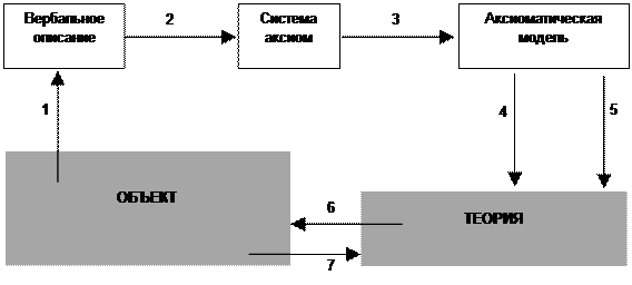 Ключевым моментом здесь является разработка совокупности положений (аксиом), экспликация которых способна привести к искомым моделям. Модели получаются в результате формального вывода из аксиом отображений реальных внутрисистемных процессов, происходящих в некоторых заданных или произвольных локальных окрестностях состояний систем, рис. 1.