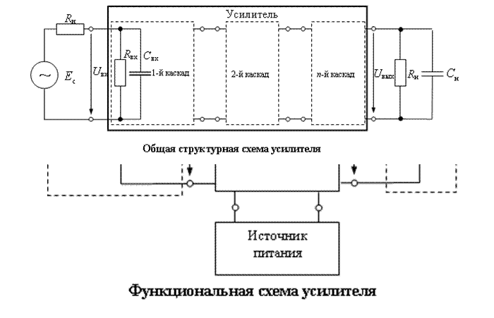Функциональная и структурная схемы усилителя.