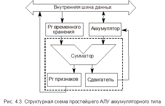 Структурная схема АЛУ простейшего микропроцессора аккумуляторного типа изображена на рис. 4.3.
