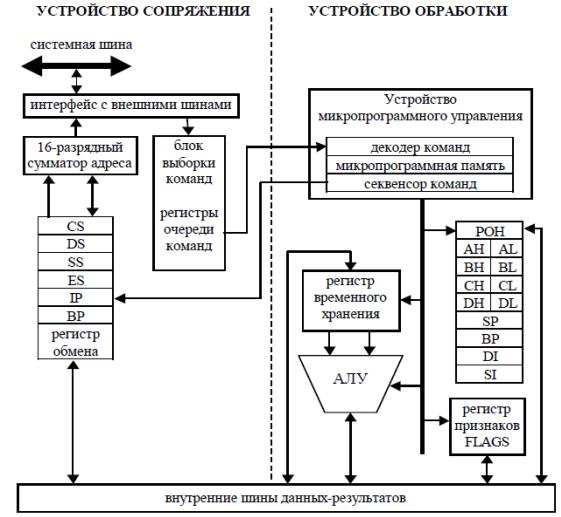 Устройство сопряжения обеспечивает формирование 20-разрядного физического адреса памяти, выборку команд и операндов из памяти, организацию очередности команд и запоминание результатов выполнения команд в памяти. В состав УС входит шесть 8-разрядных регистров очереди команд, четыре 16-разрядных сегментных регистра, 16- разрядный регистр обмена и 16-разрядный сумматор адреса, интерфейс с внешними шинами. Регистры очереди команд организованы по принципу FIFO - «первым пришел - первым вышел». УС готово выполнить цикл выборки 16-разрядного слова из памяти всякий раз, когда в очереди освобождаются, по меньшей мере, два байта, а УО извлекает из очереди команды по мере их выполнения. При выполнении команд передачи управления, например условных и безусловных переходов, очередь очищается УС и начинает заполняться заново.