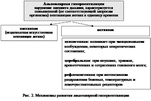 Ø гипервентиляции альвеол (рис. 2), которая вызывается вдыханием повышенных концентраций кислорода. Альвеолярная гипервентиляция относятся к типовым формам нарушений внешнего дыхания и характеризуется повышенной (не соответствующей запросам организма) вентиляции легких в единицу времени. Альвеолярная гипервентиляция может быть: